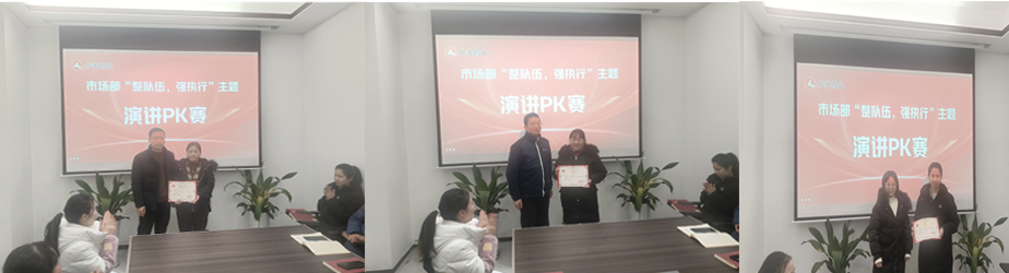 ? ? ? ?征程正未有窮期,不待揚鞭自奮蹄。?市場部秉著貫徹公司2022年“整隊伍 強執(zhí)行”的活動精神,以提升市場部人員的專業(yè)水平,解決實際工作問題的能力為目標(biāo),于2023年1月17日在和諧樓一樓會議室舉行了年度演講PK賽,特邀公司副總經(jīng)理兼財務(wù)部長陳春林、公司副總經(jīng)理兼市場部部長羅來虎、人事主管陳琦擔(dān)當(dāng)評委,比賽由汪勁松主持。